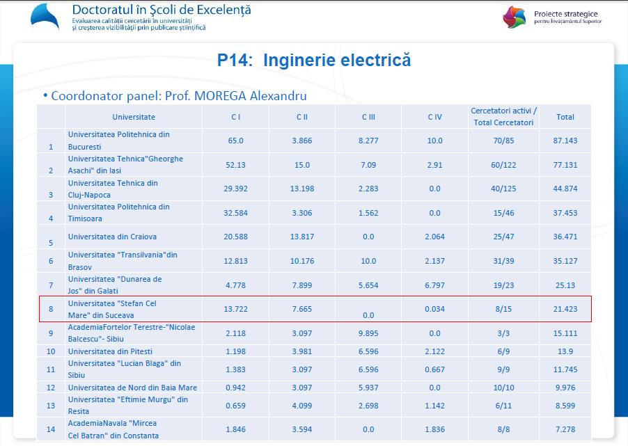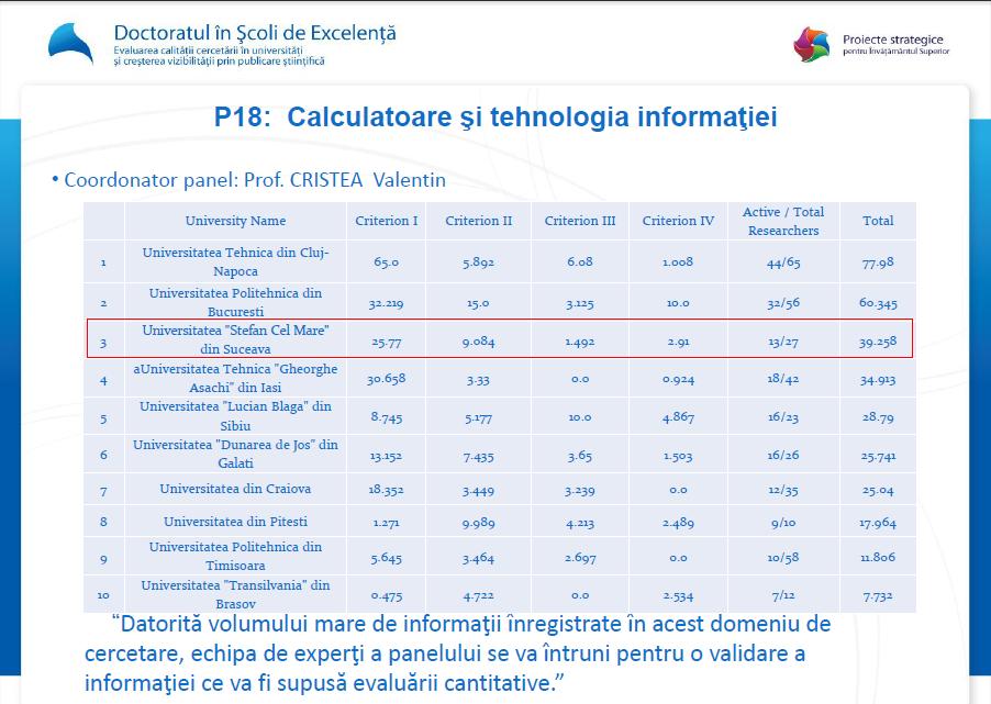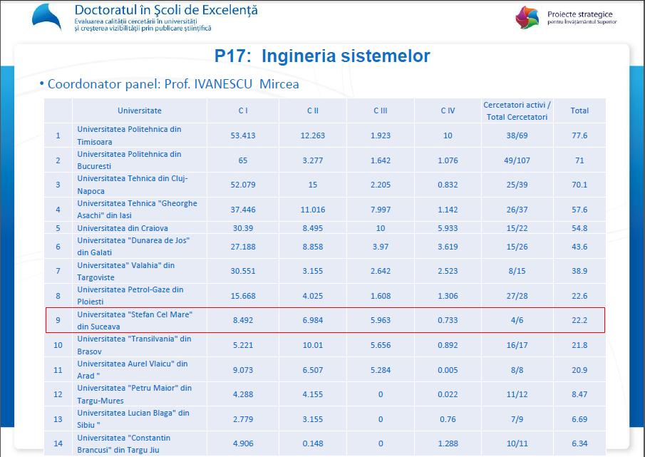 acestui exercitiu national de evaluare au fost luate in considerare performantele in cercetarea stiintifica si doctorat a colectivelor din universitatile din Romania, pe domenii de specialitate. In clasamentele